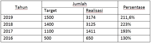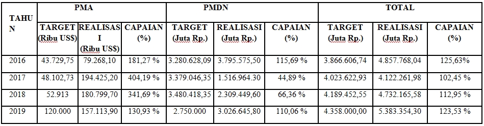 Adapun target dan realisasi investasi selama tahun 2016 sd 2019 adalah sebagai berikut: